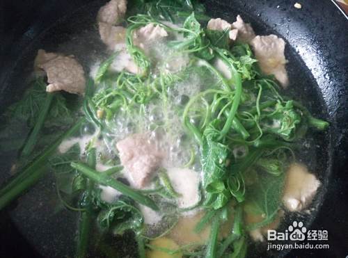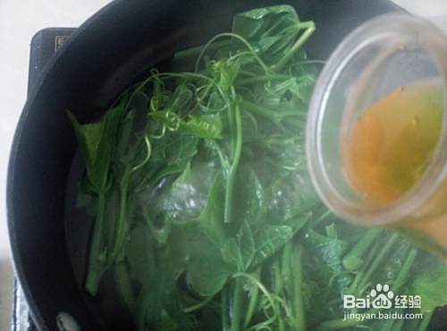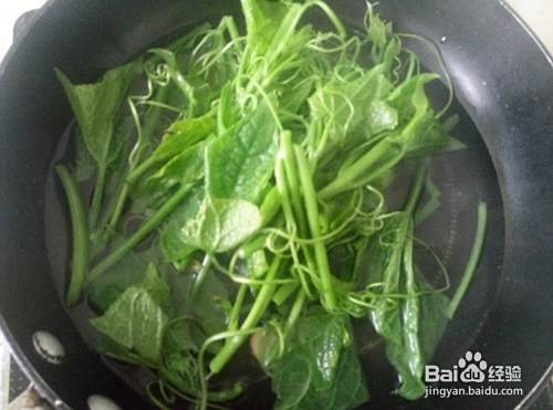 然后放佛手瓜苗进去,加适量的盐、从新煮开。