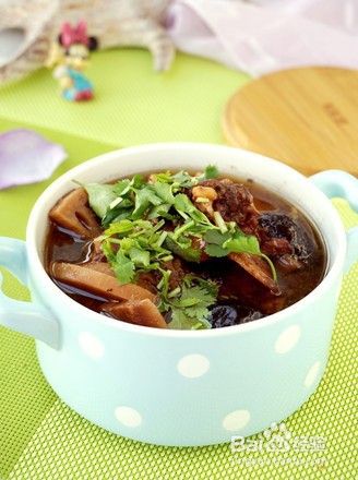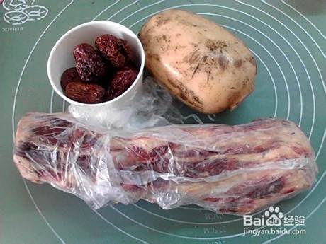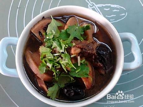 用料:牛骨500克,莲藕350克,红枣9颗,盐适量,香菜适量,姜1块