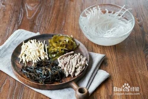另起冷水锅放八角、花椒、姜片和葱段放牛肉炖煮一个半小时,牛肉切丝,汤备用。粉条用温水泡30分钟,海带和干豆腐切丝。