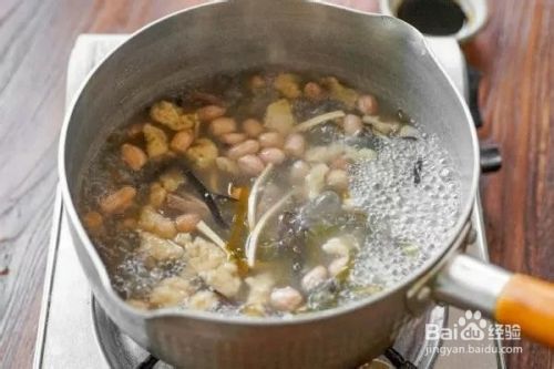 将牛肉汤煮沸,倒入花生。将洗好的面筋揪成小片下锅煮沸后放入海带丝、木耳丝、干豆腐丝、牛肉丝和粉条煮5分钟。