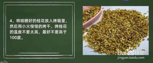 总结:1、在桂花树上采摘新鲜的桂花。2、将桂花的灰尘抖出来,然后放到流动的清水下清洗一下。3、将清洗好的桂花铺开,然后放到阴凉的地方晾晒,晾晒时在桂花上面盖上干净的白纸。4、将晾晒好的桂花放入烤箱里,然后用小火慢慢的烤干。