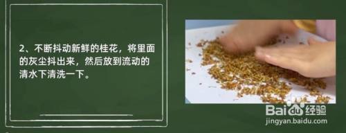 步骤2:不断抖动新鲜的桂花,将里面的灰尘抖出来,然后放到流动的清水下清洗一下。