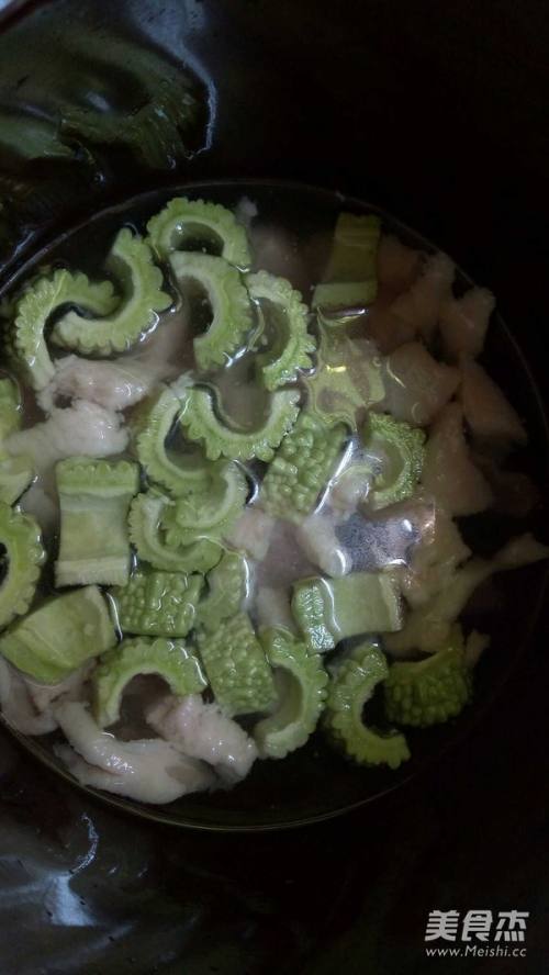 将肉片和苦瓜放入锅中,加水,水过材料就可以了