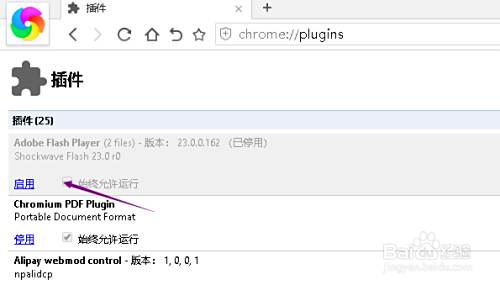 在插件管理界面,找打adobe flash player项次,默认是开启的,如下图所示