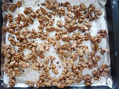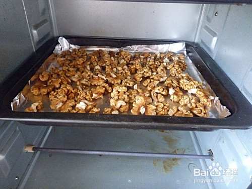浸泡入味的核桃仁捞出吗,控干表面水分,放入烤盘,放入160度的烤箱,上下火烤15至20分钟