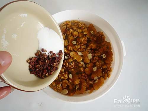 浸泡了半天的核桃仁,我尝了一个,已经有很浓的花椒味和咸味