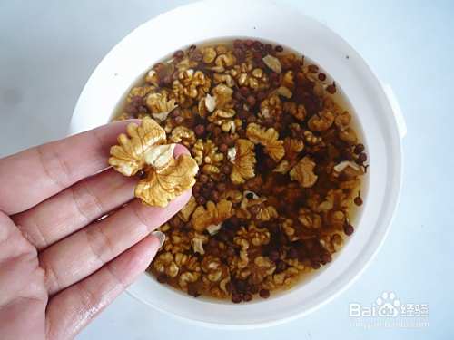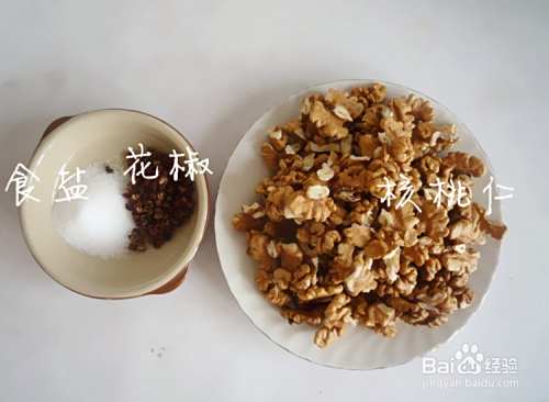 核桃仁放入容器中,加入清水莫过核桃仁。加入适量食盐和一小把花椒