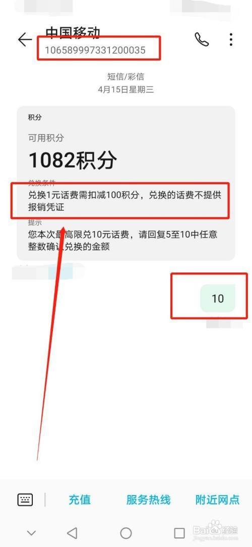 等待一段时间,号码为:106589997331200035的中国移动会发给您一条短信,短信内容为您的可以用来换话费的积分(100积分=1元话费)。您能换多少元话费就回复它数字多少。