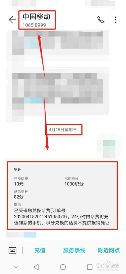 回复数字之后,号码为:10658999的中国移动会回复您已经开始帮您处理积分换话费的活动。话费到账还需要一段时间。