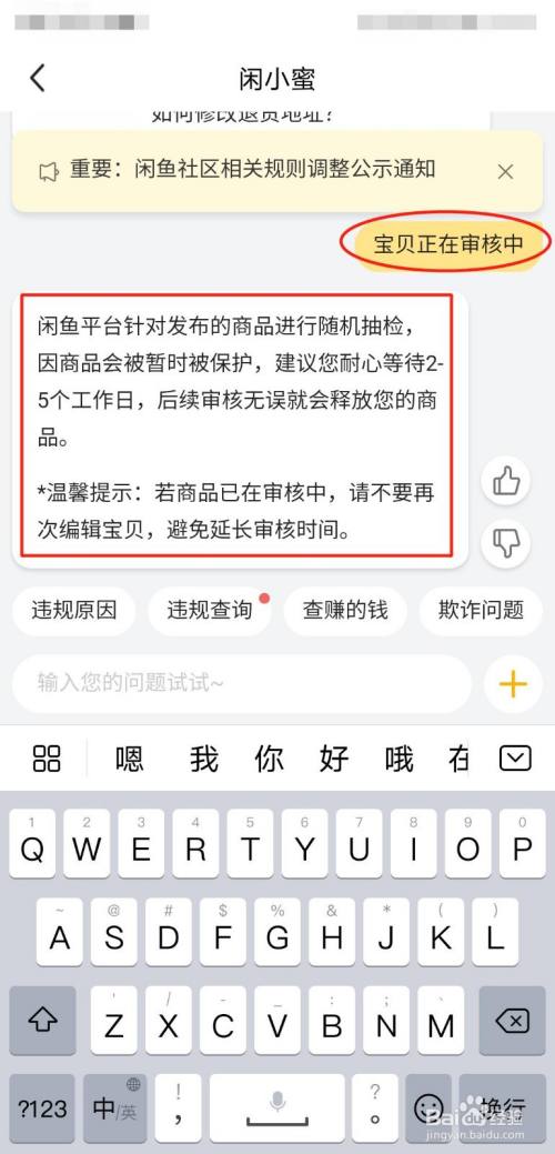 在闲小蜜对话框中输入“宝贝正在审核中”,官方回复如下截图:建议您耐心等待2-5个工作日,后续审核无误就会释放您的商品。