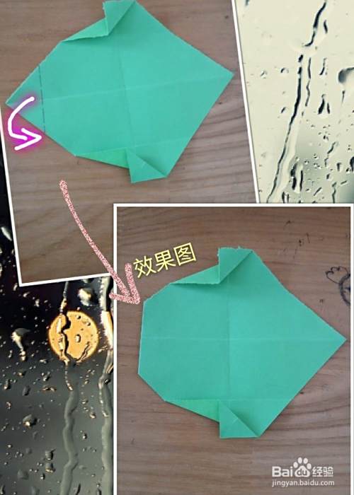 将上一步翻折进来的两个尖角分别沿所画虚线向外翻折!效果如下!