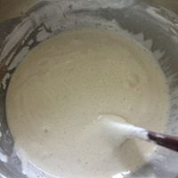 盆里倒入170ml的水加入幼砂糖,慢慢一点点加入糯米粉搅拌融合至无颗粒状态