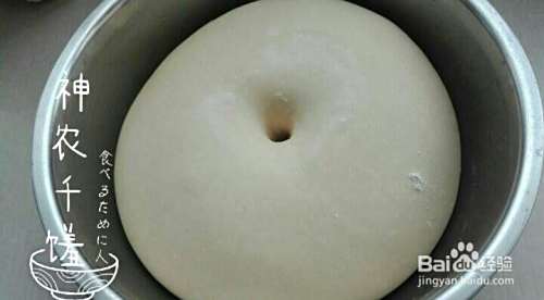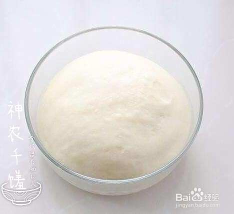 2. 将揉好的面团放进大一点的容器里,盖上保鲜膜进行发酵,注意面团发酵到原来的2.5倍大小左右,用手指或筷子在面团上插个洞,然后拔出后看下插的孔洞如果保持原状,不回缩也不塌陷,那么就发酵好了。