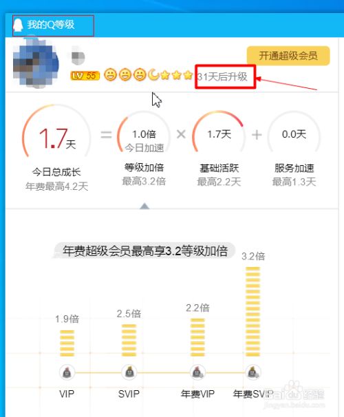 在“我的Q等级”下方可以看见如何快速增加天数,普通VIP 是1.9倍,而年费SVIP是3.2倍,所以你如果是SVIP的话 你登录一天就可以获得3.2天的时长,用不了多久时间你就可以获得一个太阳.