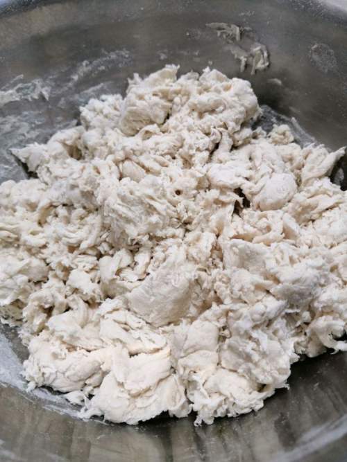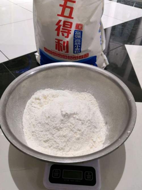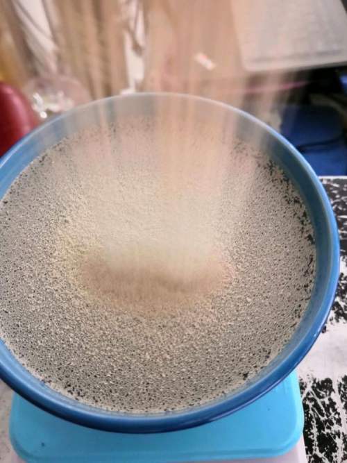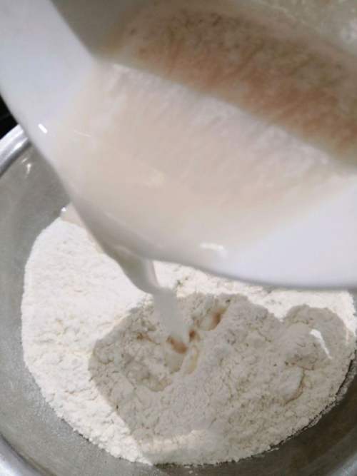 6温水把发酵粉和白糖搅拌均匀倒入面粉里。