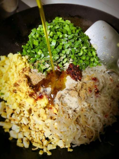 11韭菜、鸡蛋、粉条、豆腐洗净切成图中形状备用。
