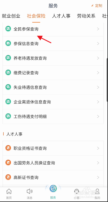 进入服务,找到社会保险,点击下方的全民参保查询进入