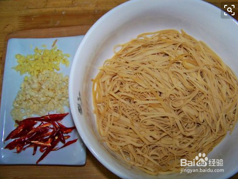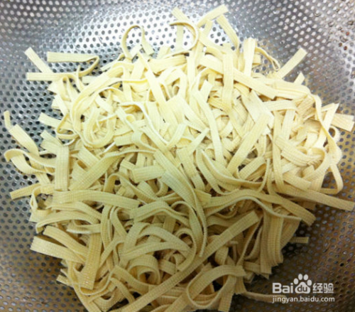 千张洗净,切丝下锅戳水5分钟,捞出沥水备用
