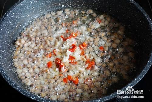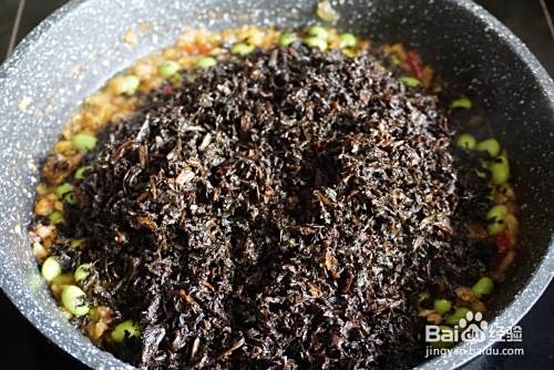 放入萝卜干.毛豆仁.翻炒一会儿.