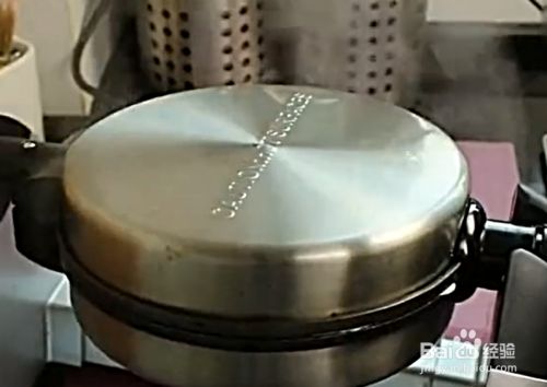 预热华夫饼机,然后稍等片刻,倒上刚才做好的料,不能太慢,大概八成左右