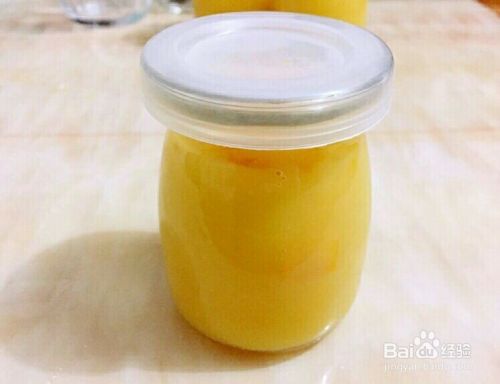 将芒果粒加入到布丁杯里,使布丁液至杯子的九分满的位置