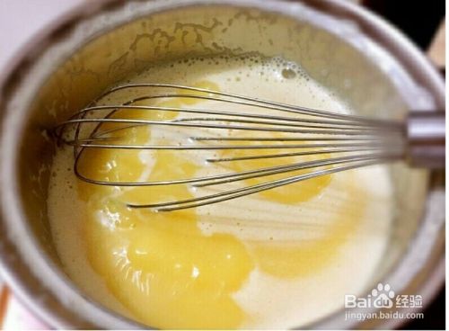 水沸腾后转小火,加入芒果味布丁粉,再用手动打蛋器搅拌至充分融合,均匀