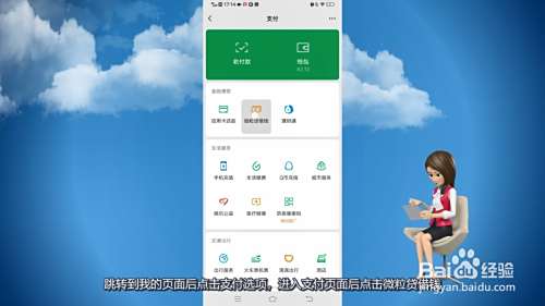 跳转到我的页面后点击支付选项,进入支付页面后点击微粒贷借钱。