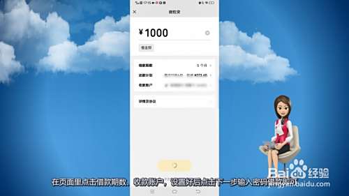 在页面里点击借款期数、收款账户,设置好后点击下一步输入密码借款即可。