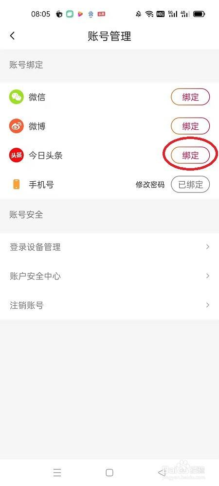 5、页面跳转后,点击“今日头条”右侧的“绑定”,如图