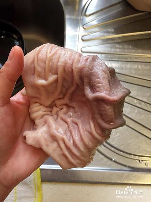 清洗猪肚,先拿清水冲洗,黄色的东西都要揪掉,肥油用剪刀剪掉