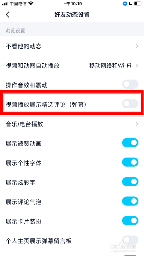 点击“视频播放展示精选评论弹幕”的功能后方的开关。
