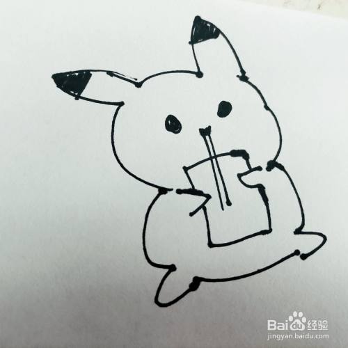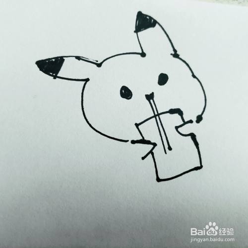 第二步,我们来画卡通皮卡丘的头部轮廓,还有手中的饮料瓶。