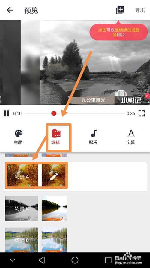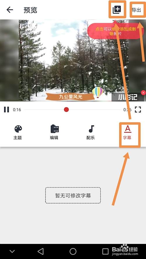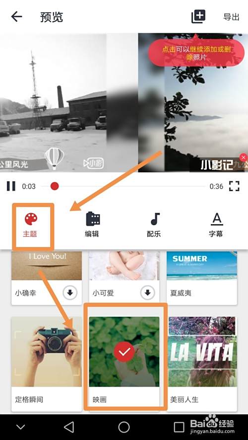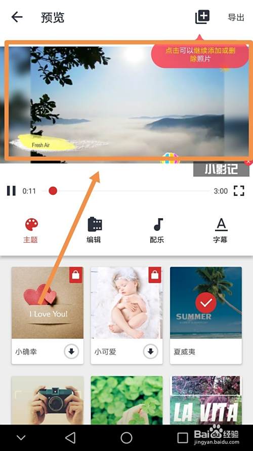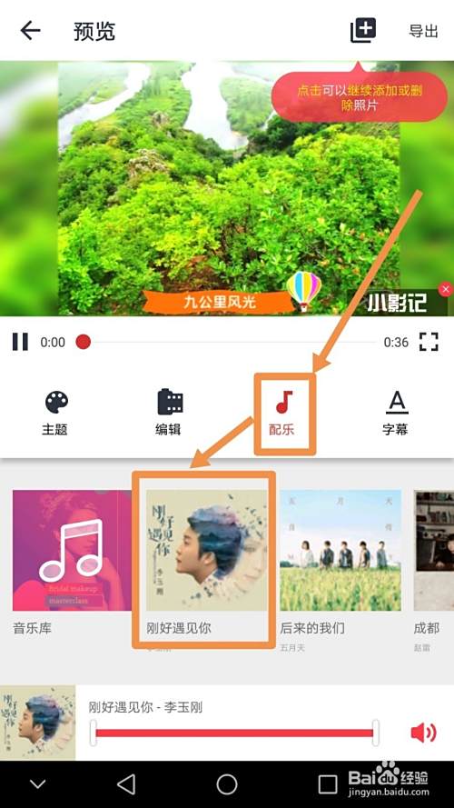 如果需要更改配乐,需要点按配乐字样标志,然后点选一首音乐作为photo video的配乐,如果要对字幕进行编辑,需要点按字幕标志,如果需要增加图片场景,点按界面上方的添加标志,完成所有操作后,点按导出标志可以导出视频。