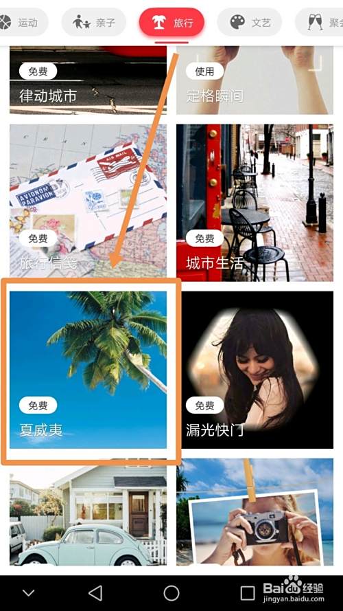之后在旅行主题中选择一个特定的主题,此处选择的是夏威夷,在之后的主题界面中点按免费试用标志。