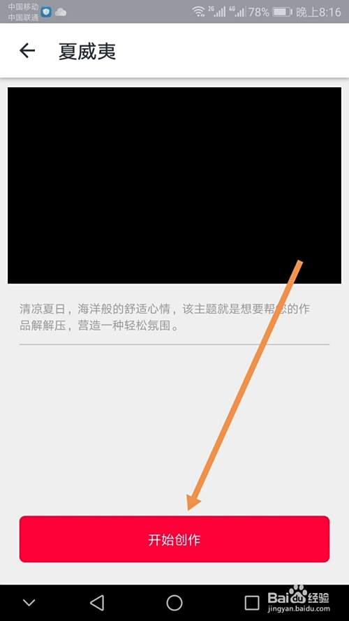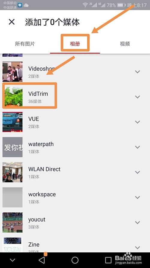 主题加载完成后点按箭头指向的开始创作标志,之后界面会转入到添加媒体界面,此处点按相册,然后找到存放图片的相册,点按进入。