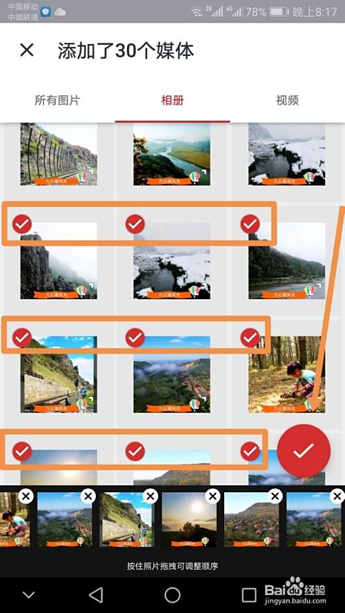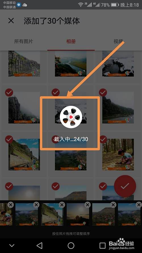 依次点选需要添加的图片,然后点按对号标志,之后应用会显示载入这些图片的百分比进度。