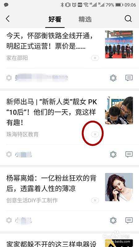 然后一方面欣赏美文,也有很多自己不感兴趣的文章,那我们就点击这篇文章标题的右下方的那个X。如图所示。