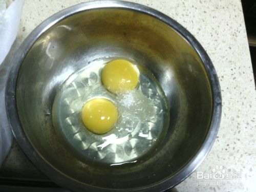 首先就是要把准备好的鸡蛋打到一个大碗里,然后分别放上盐(一点点就可以了)、白糖(以自己的口味为准,可以先放两勺,不够可以之后再加)、食用油或者是橄榄油几滴就可以了。