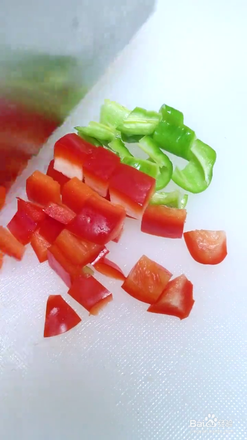 首先准备好炸好的花生米,然后配料准备青红椒,切成小块,黄椒切丁备用
