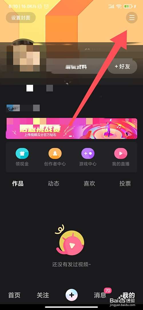 进入到个人页面,可以看到顶部右侧有个三横图标,点击打开;