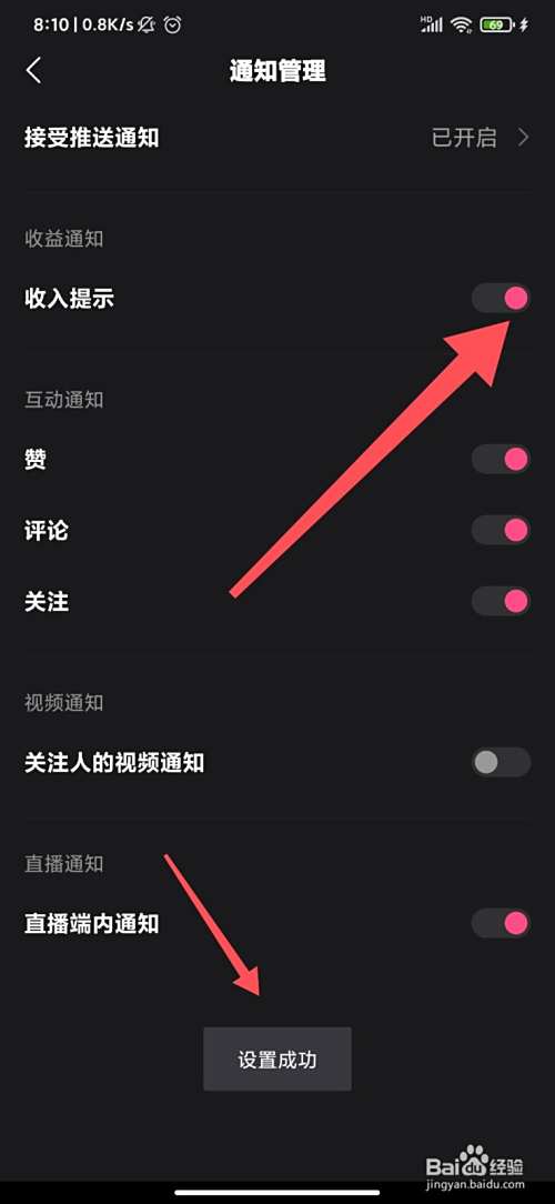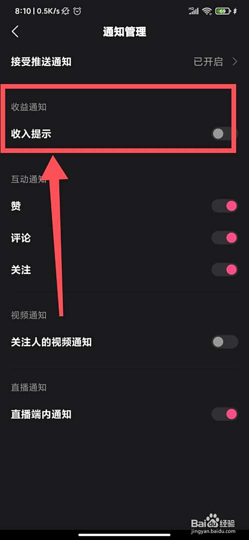 然后我们在列表中找到收益通知——收入提示,点击右侧按键;