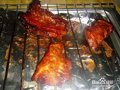 将叉烧肉放入200度预热好的烤箱中层,烘烤30分钟,下层置铺有锡纸的烤盘,以防油水溅在烤箱里