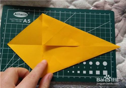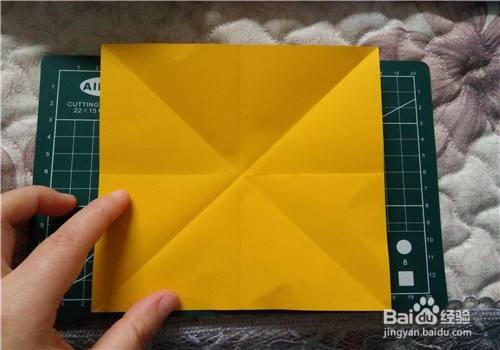 接下来再把彩纸从中间对折,如图一。把彩纸转一下,把四个角垂直翻折,如图二。我们再把右侧的角向上折,如图三。