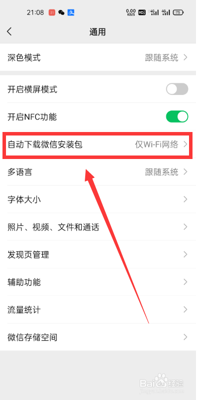 在通用页面,找到“自动下载微信安装包”,我们看到该项右侧写着“仅Wi-Fi网络”,点击进去。