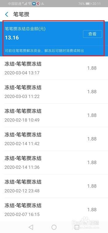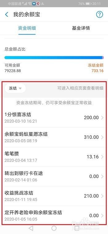 第三步点击冻结的金额之后,可以看到冻结金额的明细,选择要取出来的,点击进去