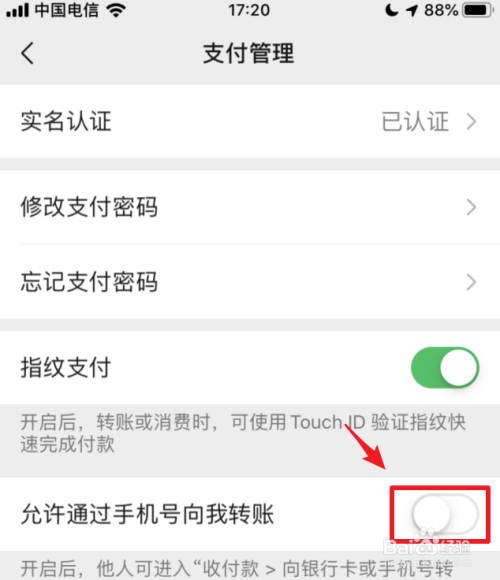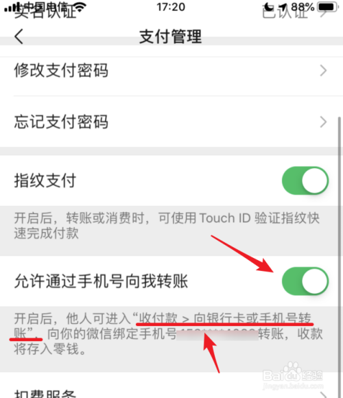 5.确认将手机号转账开关打开后,他人就可以用微信绑定的手机号进行转账。