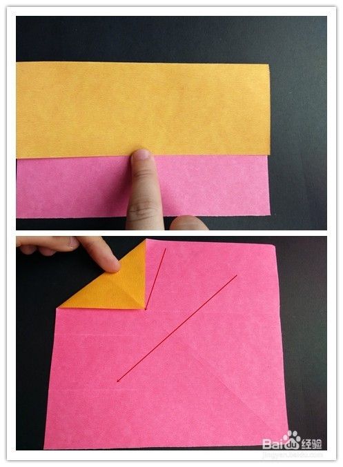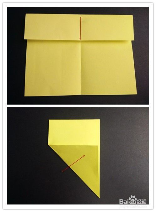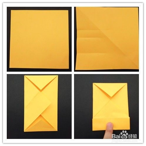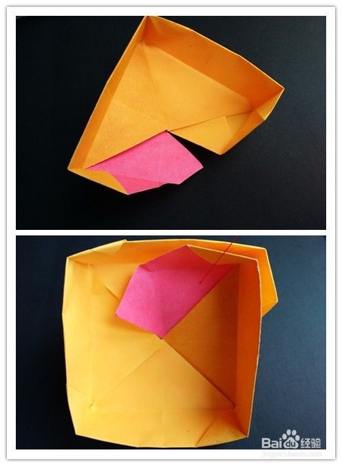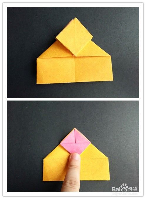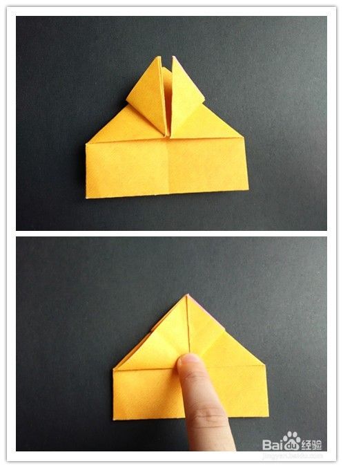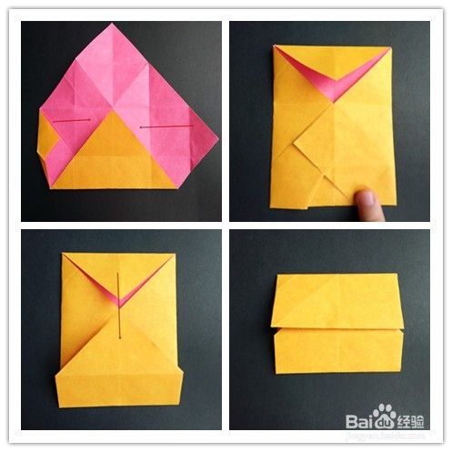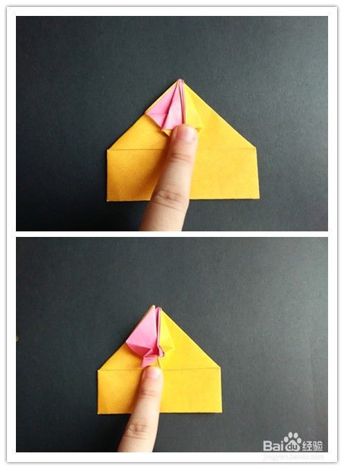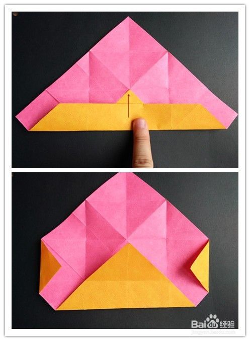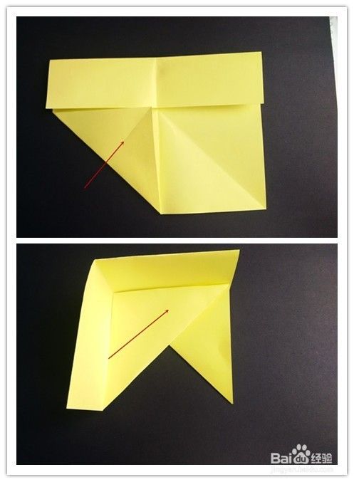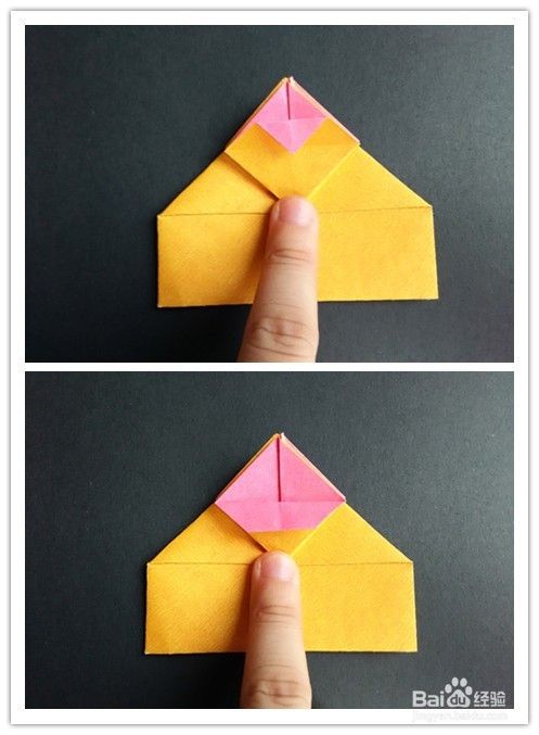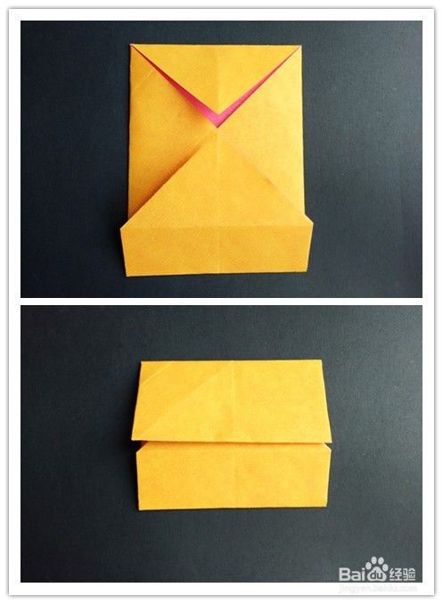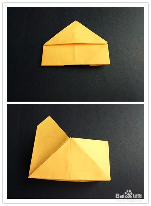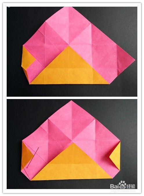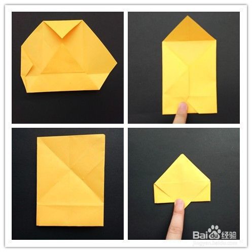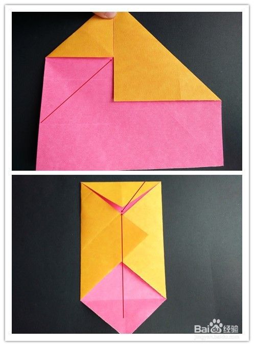 前面部分的折法重法复上述步骤1-,4,不同的是右边往左边折,左边再翻向右边,翻到背面,将纸两边折入成为一个三角形,上面部分翻折下来,下面三角形部分塞入下层。