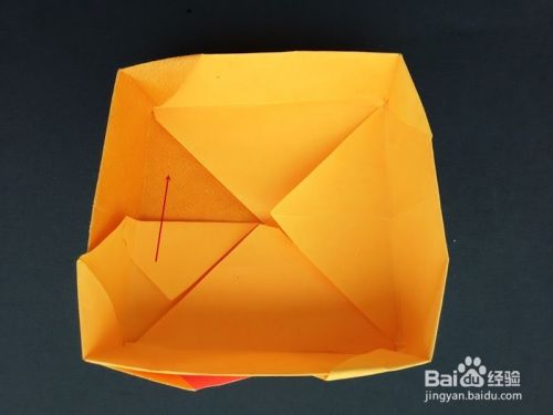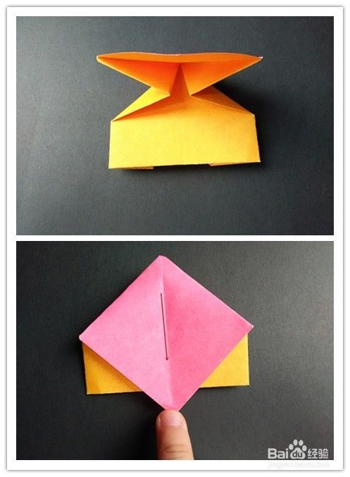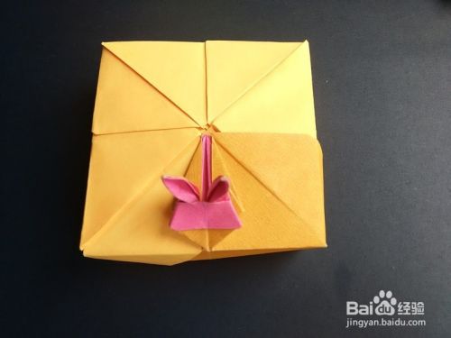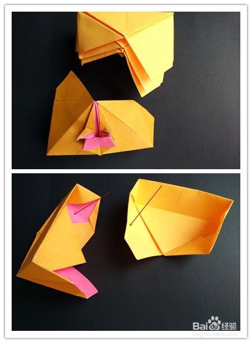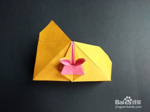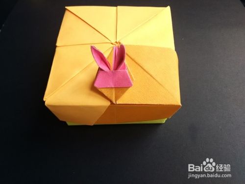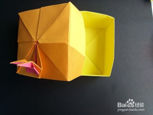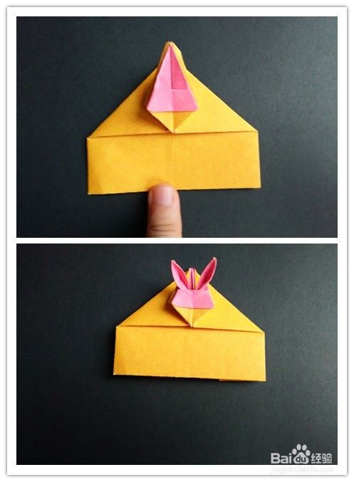 折好后将上面部分往下拉出,手指向内使耳朵竖起,如图,将下面部分拉出来折,成为四分之一盒盖。兔子盒盖部分成功。