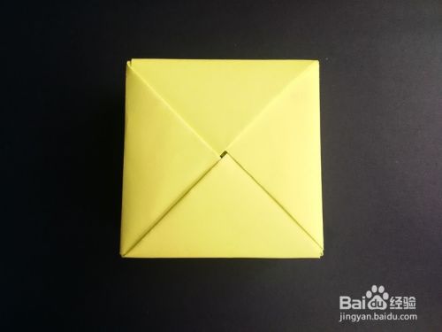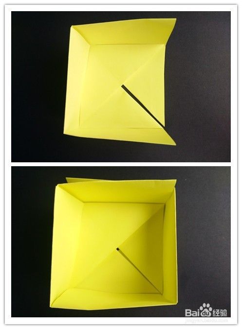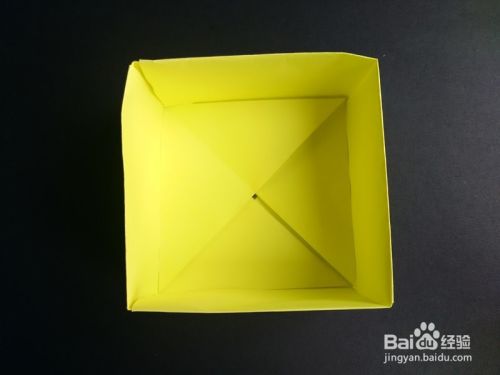 盒底同样是由四张纸折叠拼接成的,取一张正方形纸,上下折叠后左右折叠成为一个小的正方形。将纸展开,上半部分往中线折,左边部分往右对折后,下边正方形往中线折。