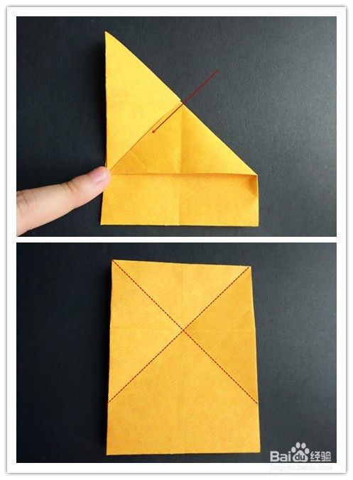 将上面部分正方形部分沿中线翻折,折好后翻到背面将背面上方正方形部分分别沿对角线折叠压出折痕。